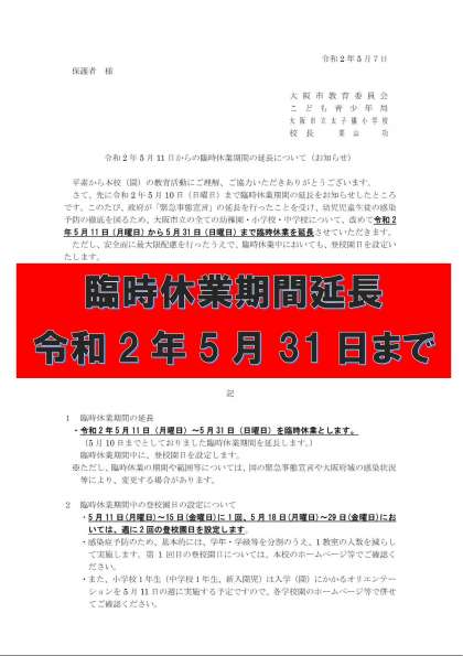 今般、政府等により「緊急事態宣言」が5月31日(日)まで延長されたことを受け、大阪市の学校園においても臨時休業期間を5月31日(日)まで延長することとなりました。