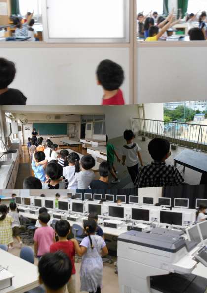 運動場が見える渡り廊下を渡ると、パソコンがずらりと並んでいるパソコン室や調理のできる家庭科室などがありました。