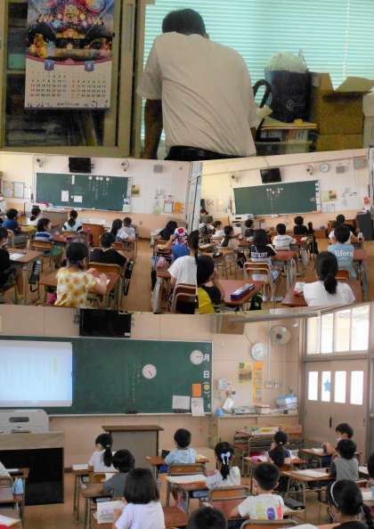 今日は朝から30度近くまで気温が上昇していたので、『児童朝会』を放送で行いました。