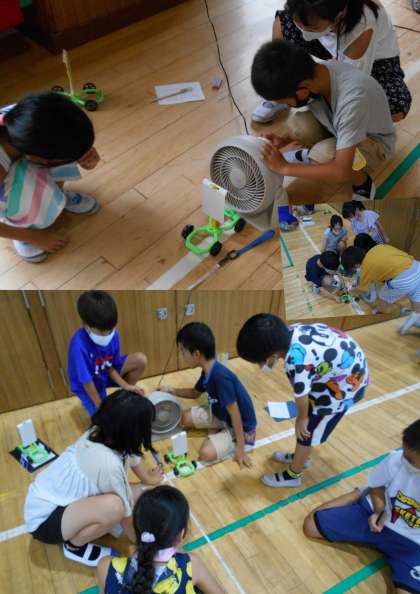 風の強さを変えると車の動きがどのように変わるのかを調べ、強く当てると速く遠くまで車が動くことを確認していました。