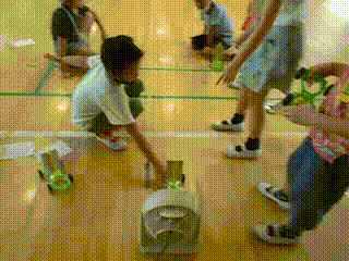 今日、3年生が講堂で『風で動かそう』の実験をしていました。