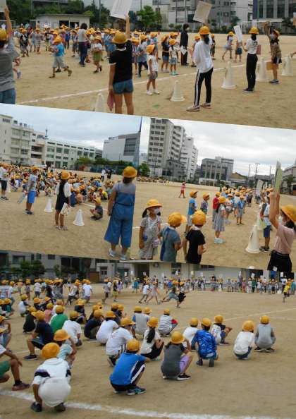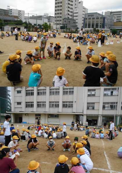 1年生は、にこにこ班リーダー会でつくってもらった名札を首から下げて、リーダーたちが掲げている班カードを見て、自分の班の番号見つけて並んでいました。