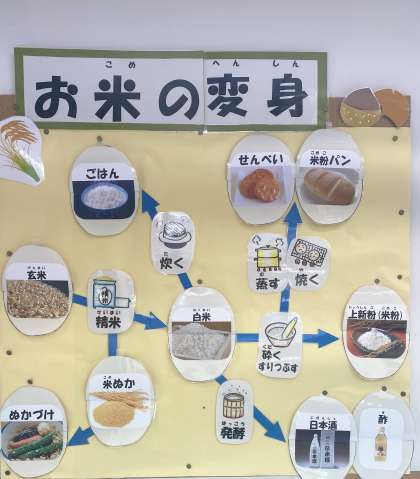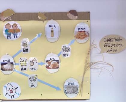 子どもたちは、「これもお米からできてるんや!」「前、給食で出たみたらしの白玉、もち米やったんや!」と楽しみながら掲示を見てくれています。