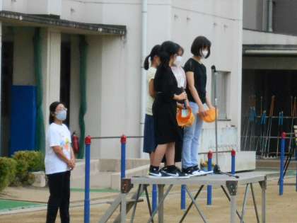 今週の月曜日に後期・代表委員会の議長・副議長・書記と各クラスの学級代表のメンバーが児童朝会であいさつをしました。