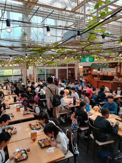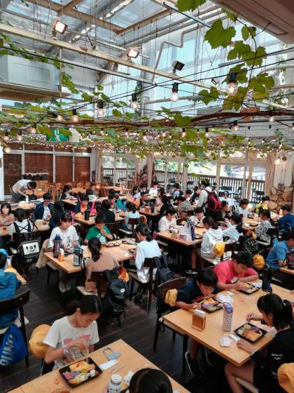 もくもくファームで昼食中です。この後、ソーセージ作りです。
