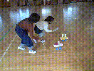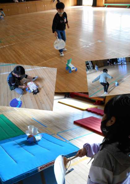 自分でつくったおもちゃを広い講堂で動かして遊んでいました。
