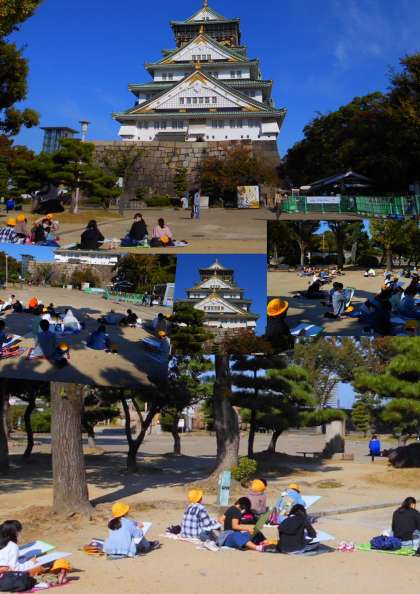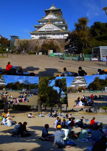 澄みきった青空のもと、自分の気に入った角度からそびえたつ大阪城を心ゆくまで描いていました。