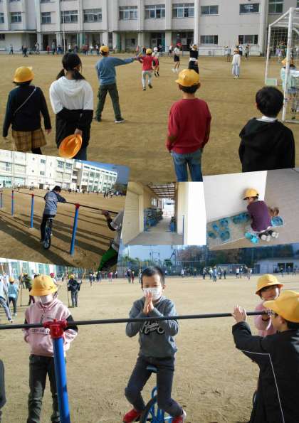 運動場では、鉄棒から手を放して一輪車のバランス練習をしていました。