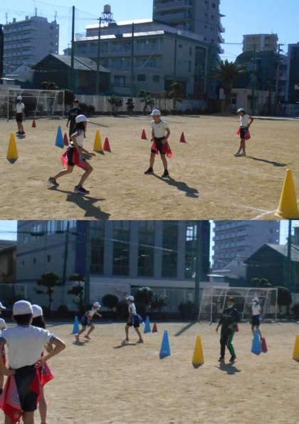 今日は、基本的な動きとなる「かわす動き」「フラッグを取ったり、取られないようにしたりする動き」の練習をしていました。