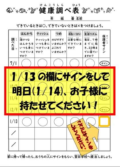 『健康調べ表』の1月の欄にサインをして、明日(1月14日)に提出してください!