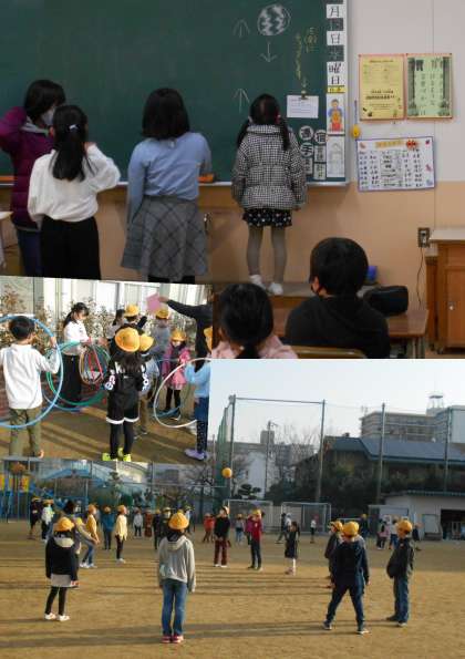 運動場では、フープを使って変わった跳び方にも挑戦です!