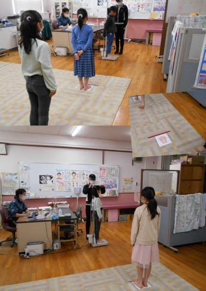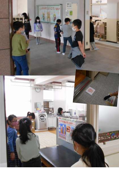 4年生は、保健室の前でソーシャルディスタンスをとって並んでいました!