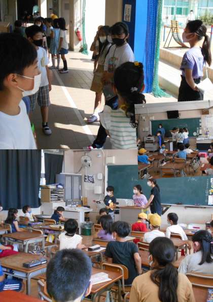運動場と講堂、教室に分かれて行うので、迷子にならないように連れて行ってもらいます。