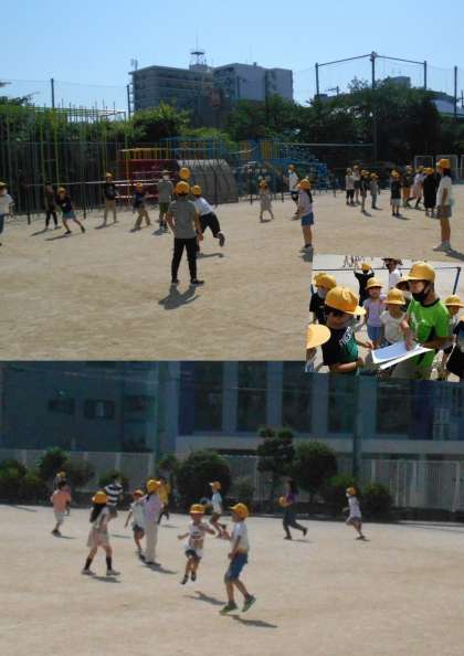 運動場では、ドッジボールや鬼ごっこ、講堂では、一本橋ジャンケン、ハンカチ落としなどをして遊んでいました。