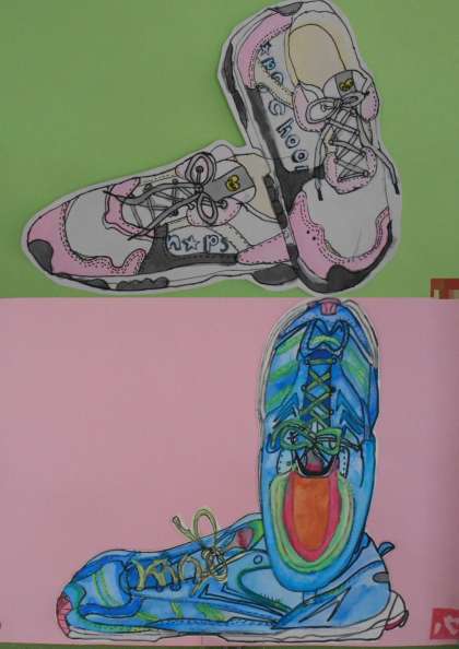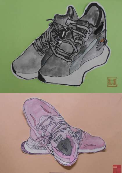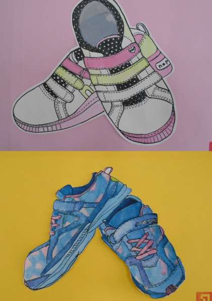 はじめに自分のくつを机上に置き、色々な向きに置いてみて自分のえがきたい角度を決めました。