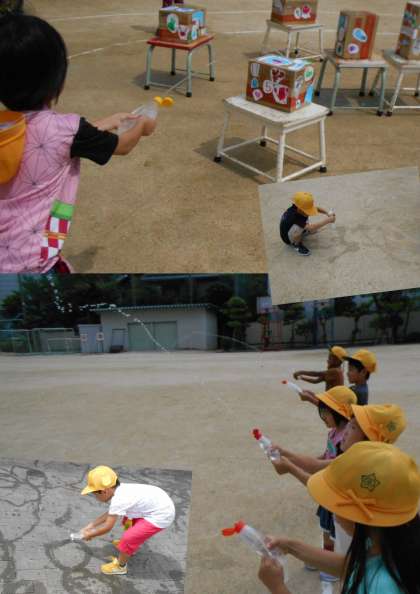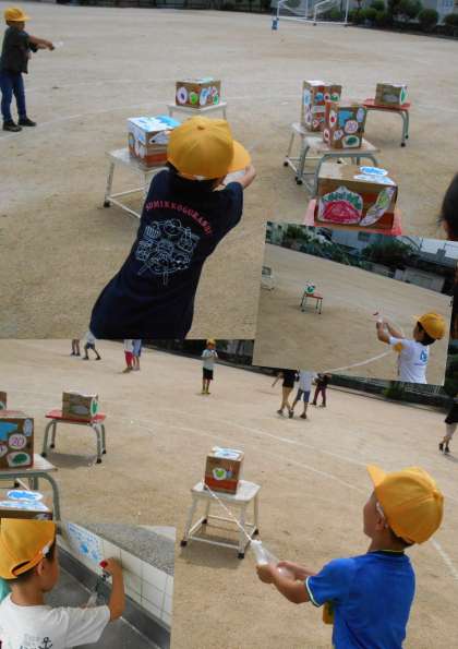『20点に当たったでぇ~!』と、段ボールでつくった的をめがけて発射したり、だれが一番遠くへ飛ばすことができるのかを競争したりしていました!