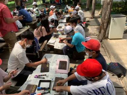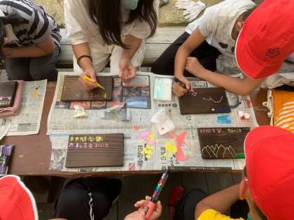 焼き板にペイントをしています。