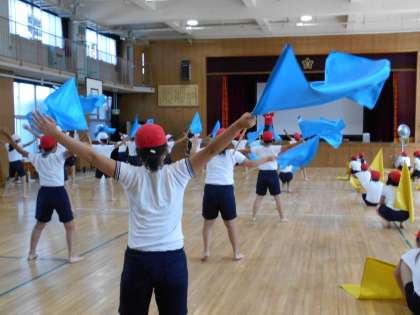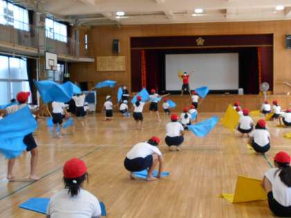 演技は『低学年』・『中学年』・『高学年』と2学年ごとに行いますが、講堂での練習は人数を減らすために1学年ごとにしています!