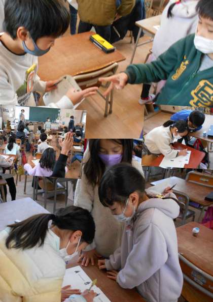 負けた方は、“My name is ~.”と言ってから、勝った人の紙に自分の名前を書いてあげます。