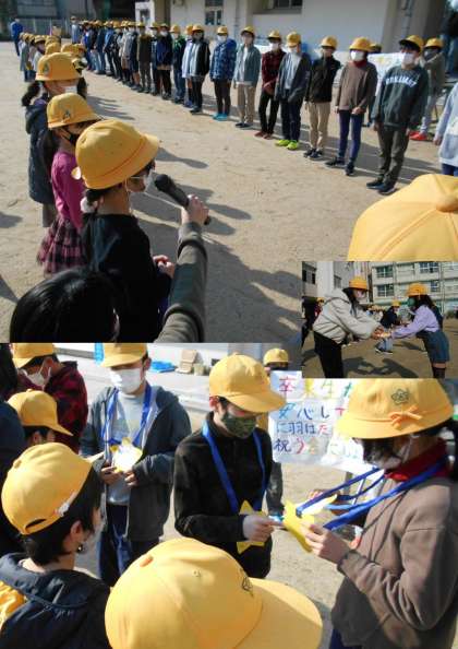 6年生からは、手作りのぞうきんが各学年の代表に手渡されました。