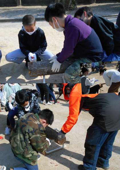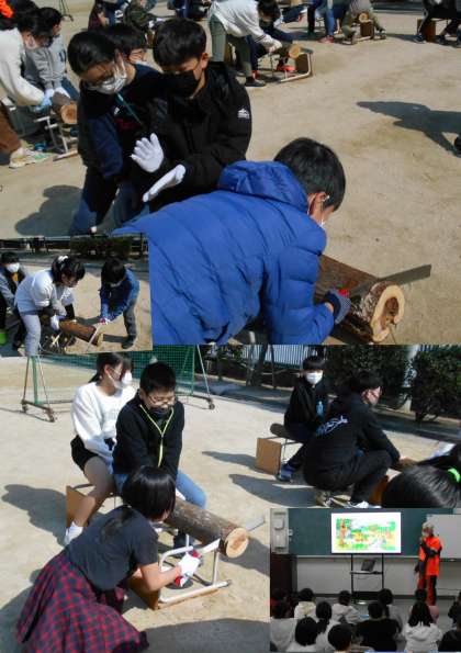 5年生が、5時間目に運動場で『丸太切り体験』をしました。