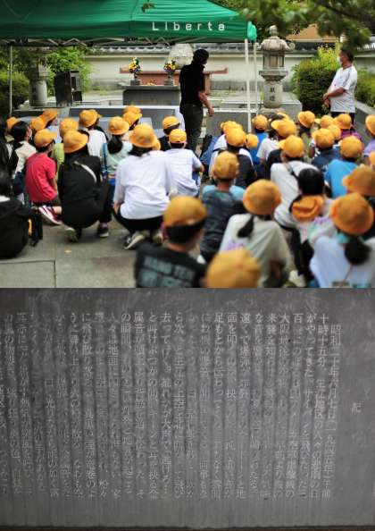 現地の碑文によると『1945年(昭和20年)6月7日大阪を襲った大空襲の際、大阪市内で死者数万人を出したが、そのうち身元不明の人、千数百人の遺体を城北公園裏の淀川堤に集められ荼毘に付された。』とあります。