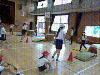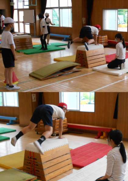跳び箱を跳び越すときには腰を高く上げることが大切で、準備運動では『ロバのあし打ち』をしていました。