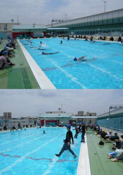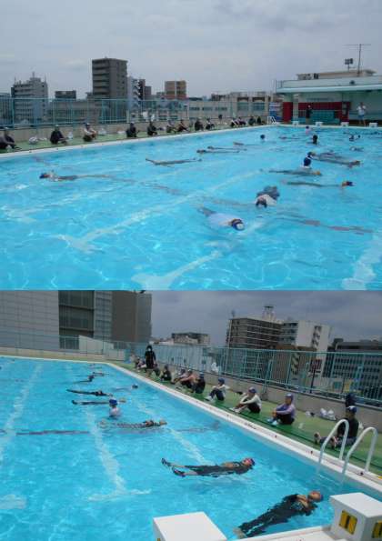 着衣泳では、着衣のまま急に水に落ちてしまった時でも、無理に泳ぐことなく、救助されるまで呼吸を確保し、浮いていることにより、「自分の生命は自分で助ける」ことができるようにすることを目的としています。