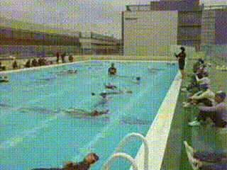 ほかには『ジャイアントストライドエントリー』で水の中へ落ちる練習もしました。いつもと違って勢いよく水の中へ入っていく感覚を体験することもできました。