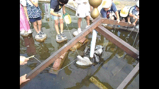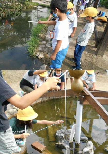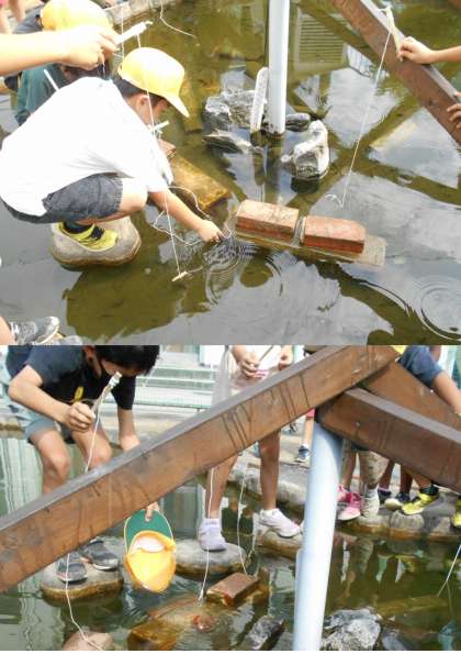 今日は、2年生がビオトープの池で『ザリガニつり』をしていました。
