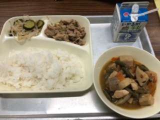 今日のメニューは、豚肉のねぎしょうゆ焼き、ふきよせ煮、きゅうりともやしの甘酢あえ でした。