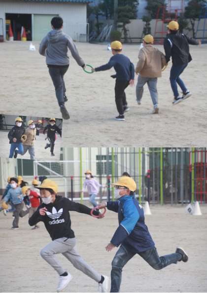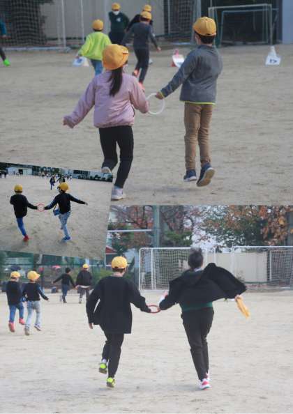 今朝の『パワーアップタイム』は、リングバトンを使った『手つなぎリレー』でした。