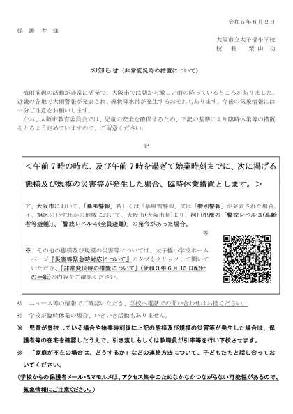 「非常変災時の措置について」の手紙を本日配付いたします。