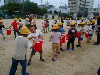 2年生は、はじめに『バケツリレー』を行いました。