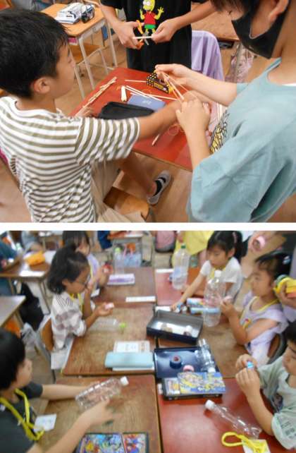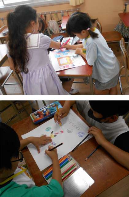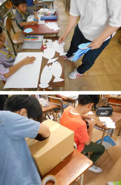 お店の『案内ポスター』をかいたり、『くじ引きの箱』・『つりの魚』などお店で使うものをつくったりしていました。