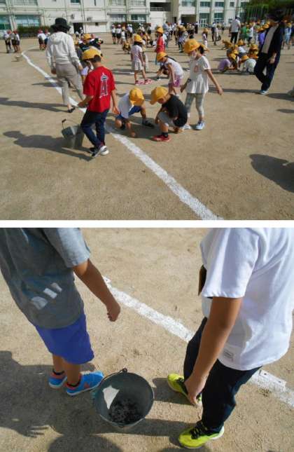今朝の児童朝会後、グラウンドの石拾いを行いました。