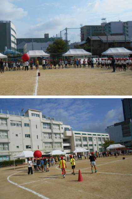 大玉を転がしたり、落とさないように頭の上を次の人たちへ送ったりします!