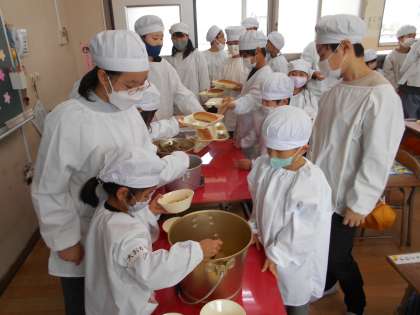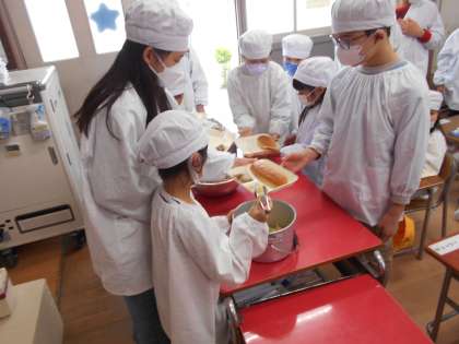 6年生のお兄さんお姉さんたちに、手取り足取り給食のよそい方など優しく教えてもらっていました!