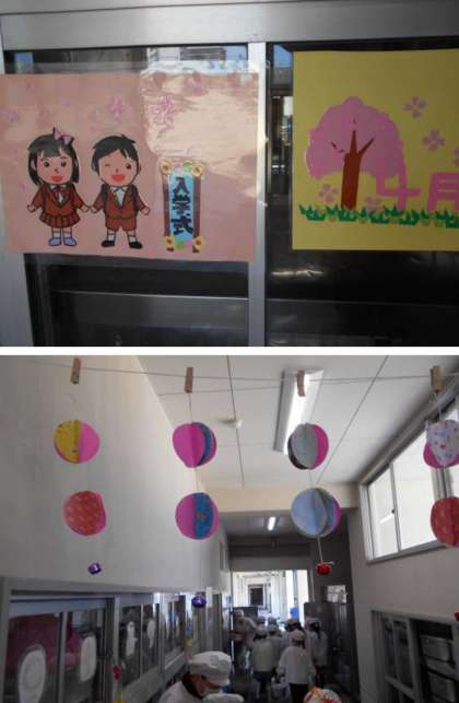 『入学お祝いバージョン』で飾られている給食室は、とても明るい雰囲気です!