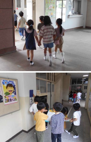 今日の『がっこうたんけん』では、2年生と1年生とが一緒に手をつなぎ、仲良くたんけんしているほほえましい光景がたくさん見られました!