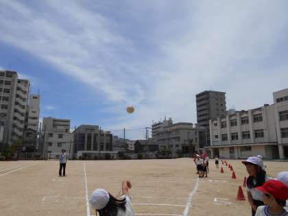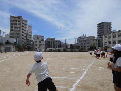 遠くまで飛ばせるように、思いきって腕をふって投げていました‼