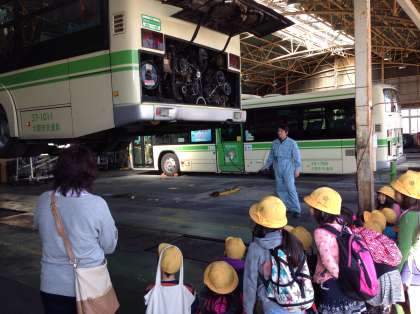 中段の写真は点呼場、ここでは当日の業務確認とアルコールチェックを見せてもらいました。下段は整備工場、持ち上げられたバスにみんな驚きました。