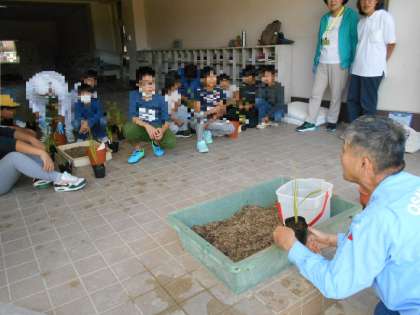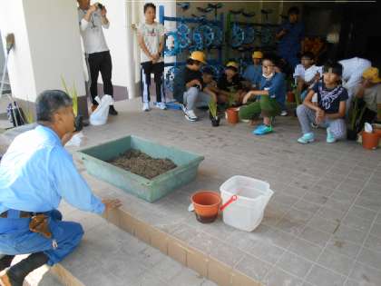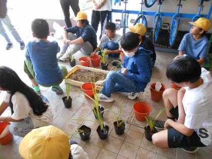 今日は委員会活動で、飼育栽培委員会の児童が花しょうぶの植え替えを行いました。