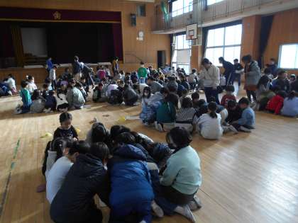 1〜5年生の児童が講堂に集まって、作業をしていました。