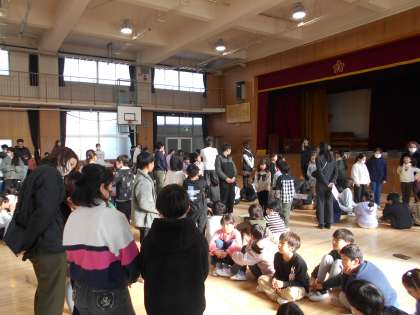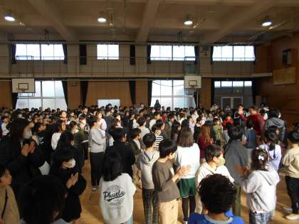 今朝、1〜5年生が講堂に集まり、『卒業生を祝う会』の練習をしていました。