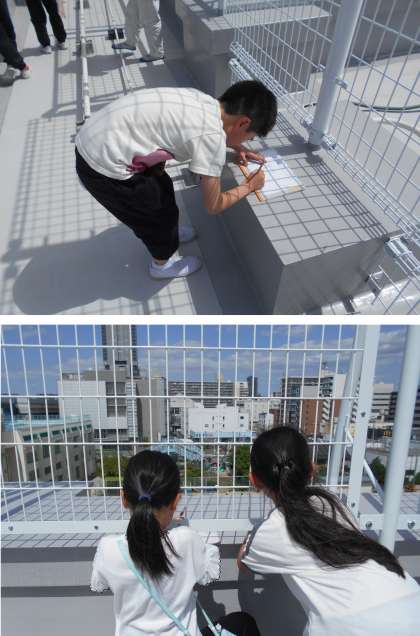 屋上からの景色に感動し、自分の家を見つけると歓声を上げる児童もいました。