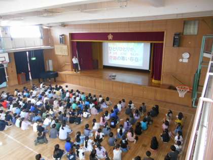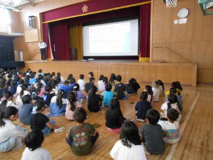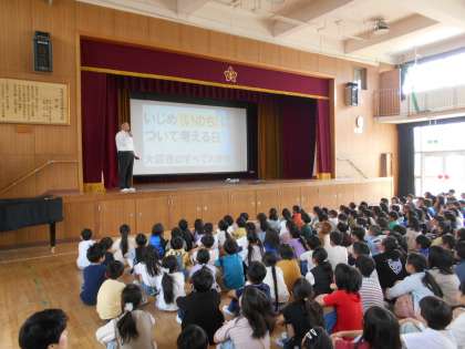 今朝の児童朝会では、互いに気持ちよく過ごせるよう『ふわふわことば』など言葉遣いを大切にし、いじめのない学校にしていこうというお話がありました。