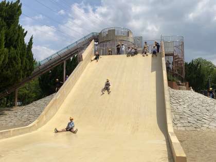 大きなすべり台で大はしゃぎしています。