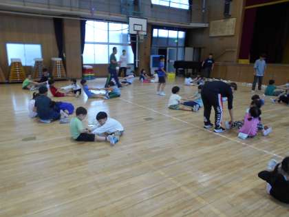 内容は、ペアで行う『腕ずもう』や、柔軟性を高める『ぎったんばっこんストレッチ』、そして投げる力を育てる『紅白玉的あて』など、楽しく体を動かすプログラムばかりでした。