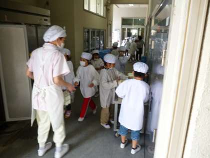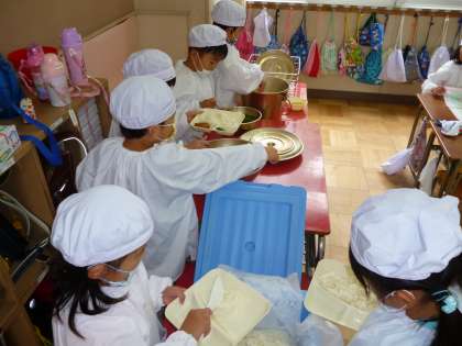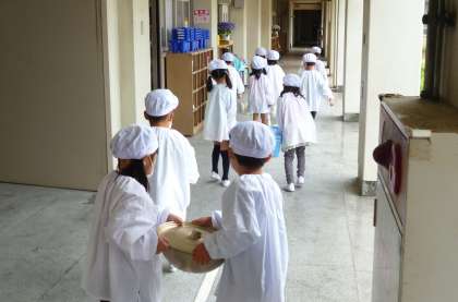 新しく小学校生活が始まって早1か月がたとうとしています。1年生の子どもたちは、重い給食を運んで、準備から片付けまでを自分たちでできるようになってきています。楽しい給食の時間の様子をご覧ください。